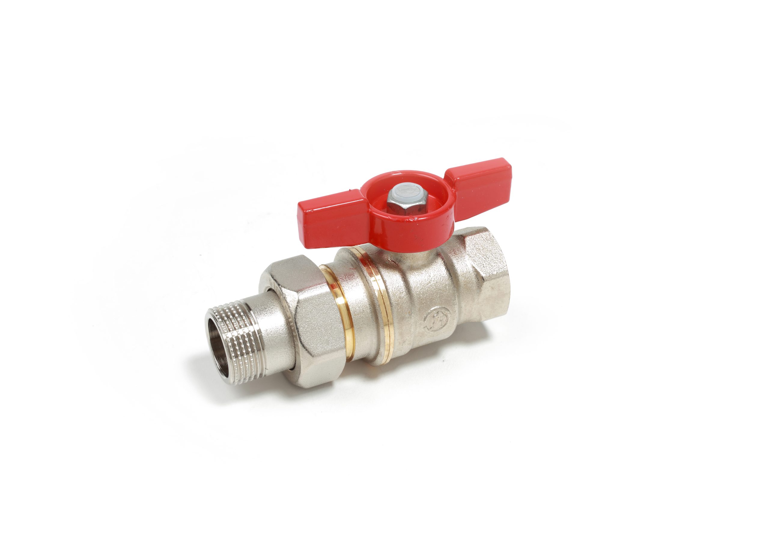 Vanne à boisseau sphérique DADO, avec raccords filetés mâles à embout femelle. Finition laiton nickelé. Port plein. Poignée en T rouge (utilisation de l’eau).